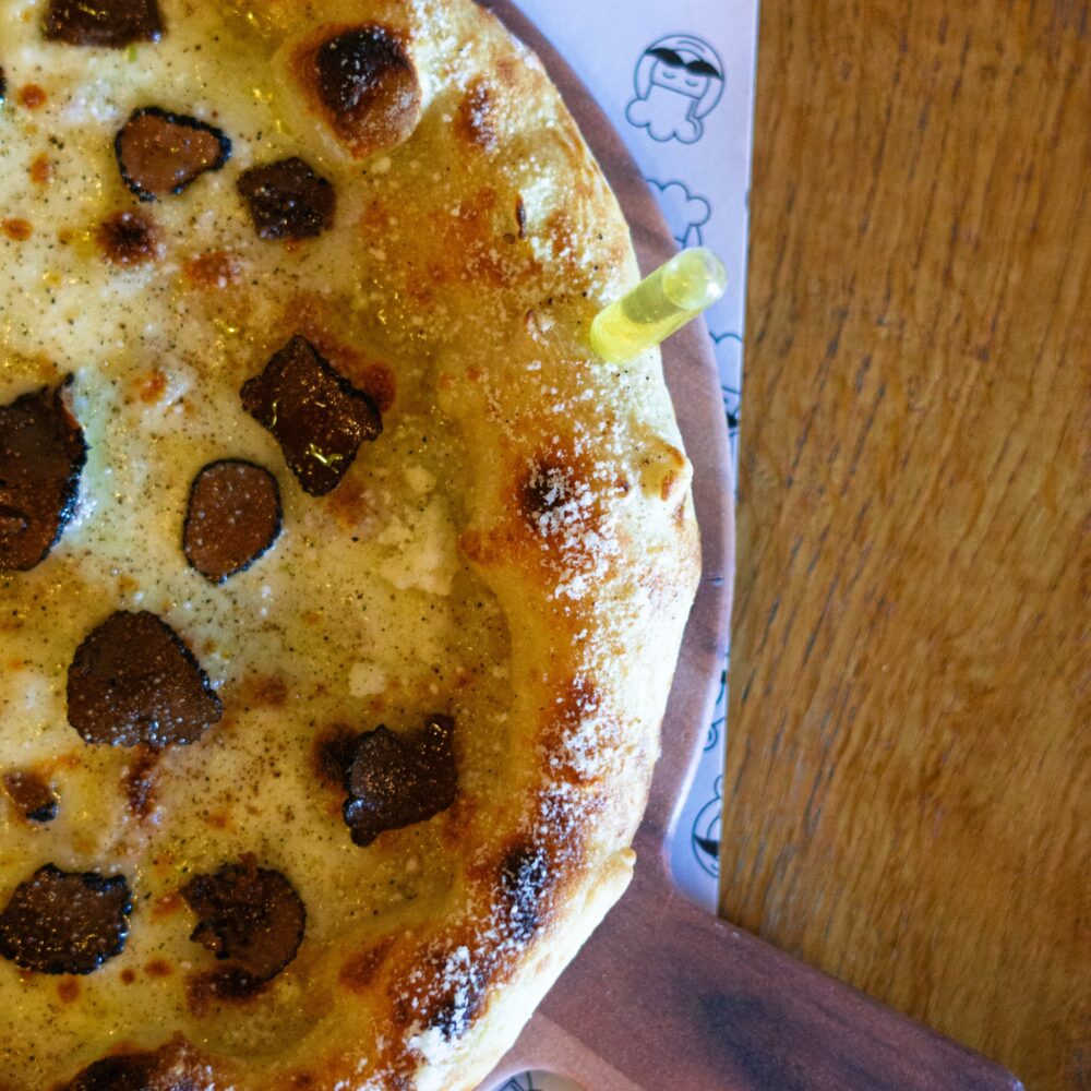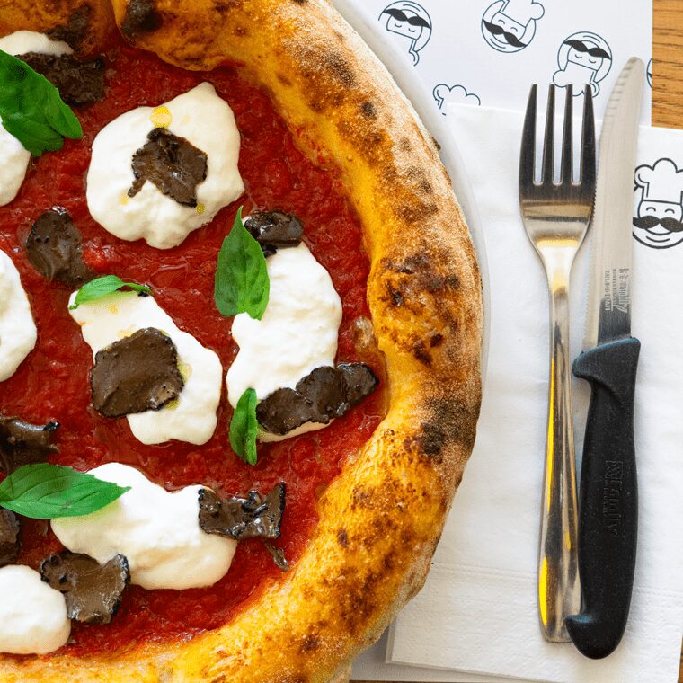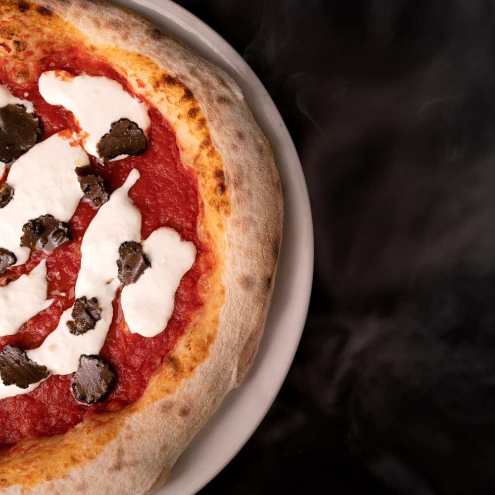 mozzarella 100% fior di latte, Pecorino romano DOP, grani di pepe nero e un’aggiunta speciale di scaglie di tartufo nero condita con olio EVO