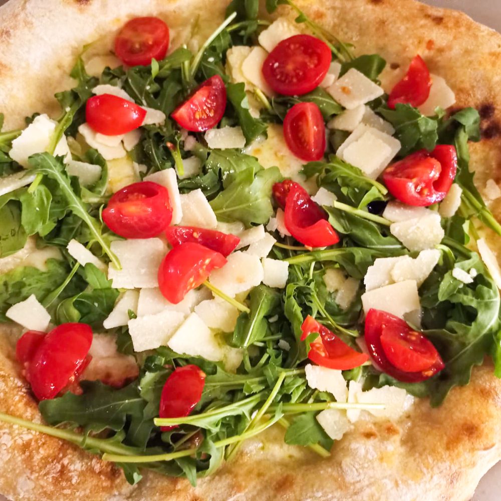 Pomodoro dal nostro territorio, mozzarella di bufala campana D.O.P., rucola a crudo, pomodorini rossi ciliegini freschi, grana a scaglie stagionato 16 mesi.